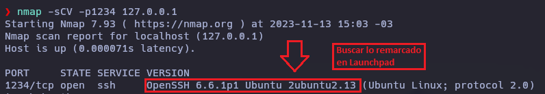 Una vez que hagamos esto, no vamos a intentar hacer Fuerza bruta, lo que hacemos con este ejemplo es averiguar mediante el uso de la herramienta nmap con un escaneo de reconocimiento, que tipo de servicio corre y que versión en el puerto 1234 que es el que establecimos para poder averiguar el Code name con la herramienta web Launch Pad