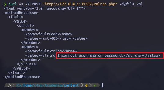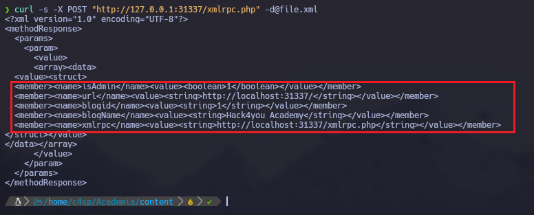curl -s -X POST "http://127.0.0.1:31337/xmlrpc.php -d@file.xml