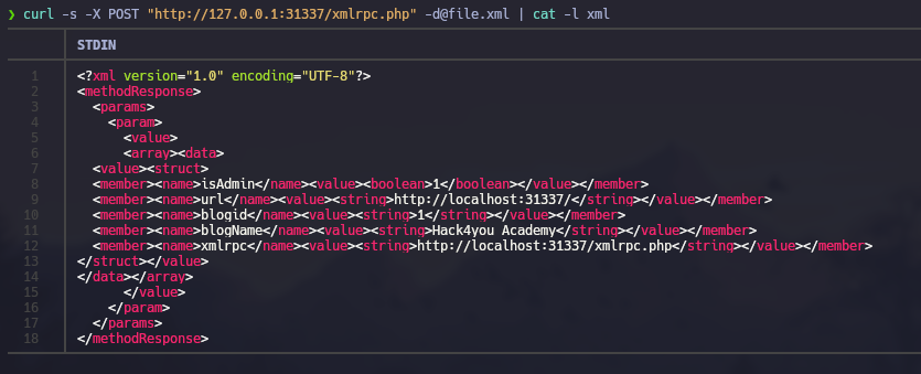 curl -s -X POST "http://127.0.0.1:31337/xmlrpc.php" -d@file.xml | cat -l xml