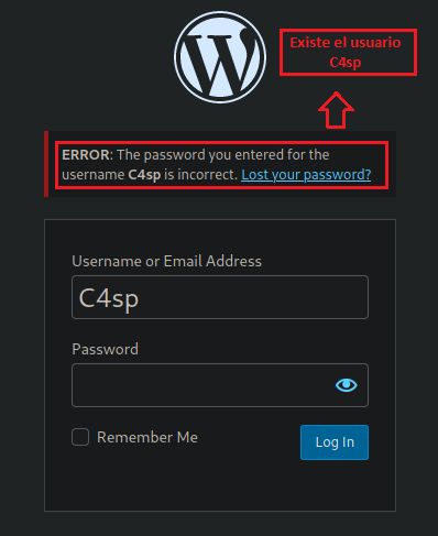 De esta manera, ya sabiendo que el usuario “C4sp” es válido, nuestro objetivo como atacante sería hackear el servidor para ganar acceso a la maquina que aloja y hostea todo el servicio web o ganar acceso a la interfaz administrativa en el panel de autenticación (Fuerza bruta).