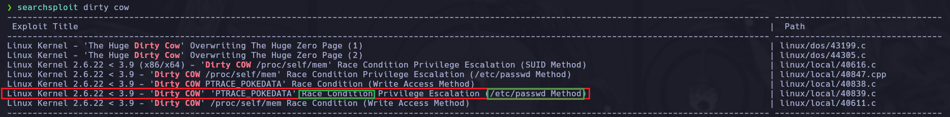 Ahora con la herramienta searchsploit haremos un searchsploit kernel 3.2 para ver los Exploits existentes para esta versión de Kernel. Tras ver todas las posibilidades veremos que hay muchas de ellas que en su nombre indican una cadena “Dirty Cow” y que todos están programados en el lenguaje C.