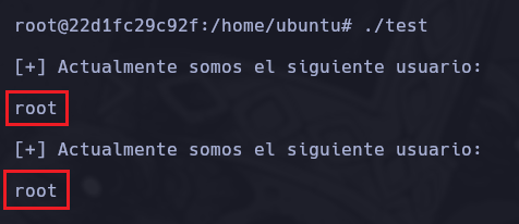 }Si le asignamos permisos SUID a este archivo con chmod u+s test.c y después hacemos un gcc test.c -o test para crear el binario test a partir del script test.c, podremos ejecutarlo con ./test