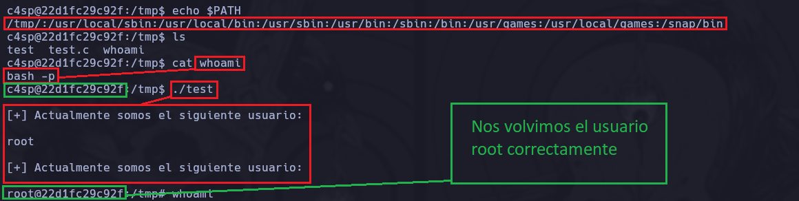 Si nosotros ejecutamos ahora ./test cuando realice el segundo whoami que está con ruta relativa, al buscar por el PATH, encontrara la coincidencia con el archivo malicioso que creamos en el directorio /tmp/ primero antes que la legitima, y de esta manera se ejecutará nuestro archivo malicioso, convirtiéndonos en el usuario root.