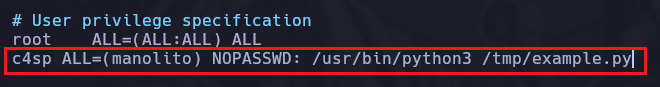 Lo primero que vamos a hacer para este ejemplo es agregar en el /etc/sudoers una especificación que indique que el usuario c4sp puede ejecutar un script en python3 de manolito ubicado en la ruta /tmp/ llamado example.py.