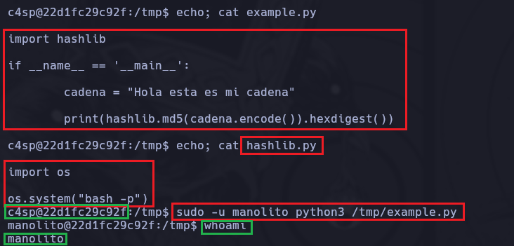 Nuestro archivo hashlib.py malicioso tendrá este contenido, por lo tanto al ser interpretado por nosotros como manolito por el privilegio de sudoers, será el usuario manolito el que nos de una consola privilegiada.