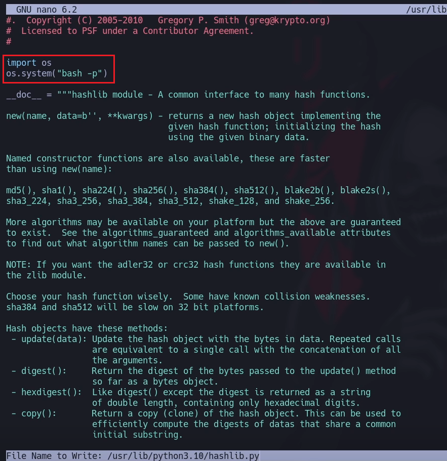 Si hacemos un locate hashlib.py veremos que la ruta en donde está almacenada la librería es /usr/lib/python3.12/hashlib.py por lo tanto algo que podríamos hacer si tuviéramos permiso de escritura en los directorios previos a ese del PATH es crear un archivo llamado hashlib.py y modificarlo agregándole una instrucción maliciosa, pero como no es el caso lo explotaremos a través de la jerarquía del PATH, es decir, creando un archivo llamado hashlib.py en el mismo directorio en donde se encuentra el script example.py de manolito, de esta manera encontrará primero nuestra “librería maliciosa” y la importará en lugar de la original.