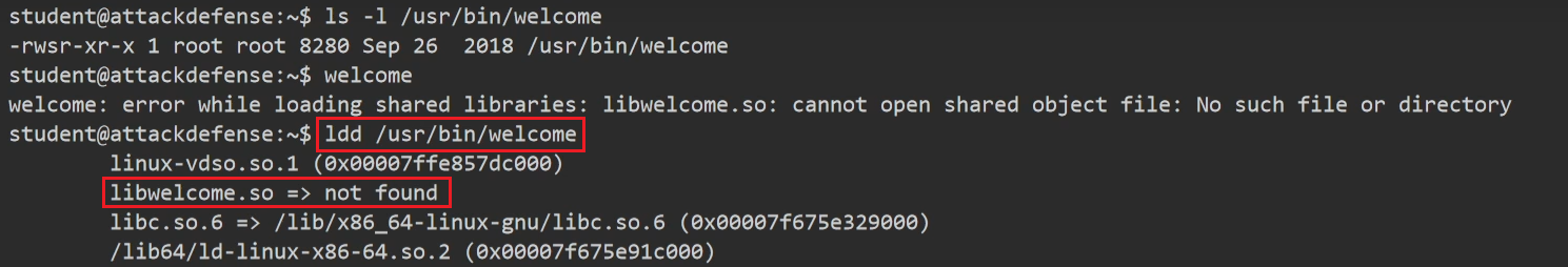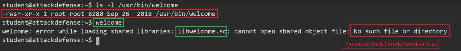 Luego con gcc convertiríamos nuestro script en binario y solo quedaría meterlo en la ruta /home/student/lib y luego ejecutar el script welcome para que automáticamente busque en esa ruta por la biblioteca, y es ahí donde tomará nuestro script malicioso llamado libwelcome.so