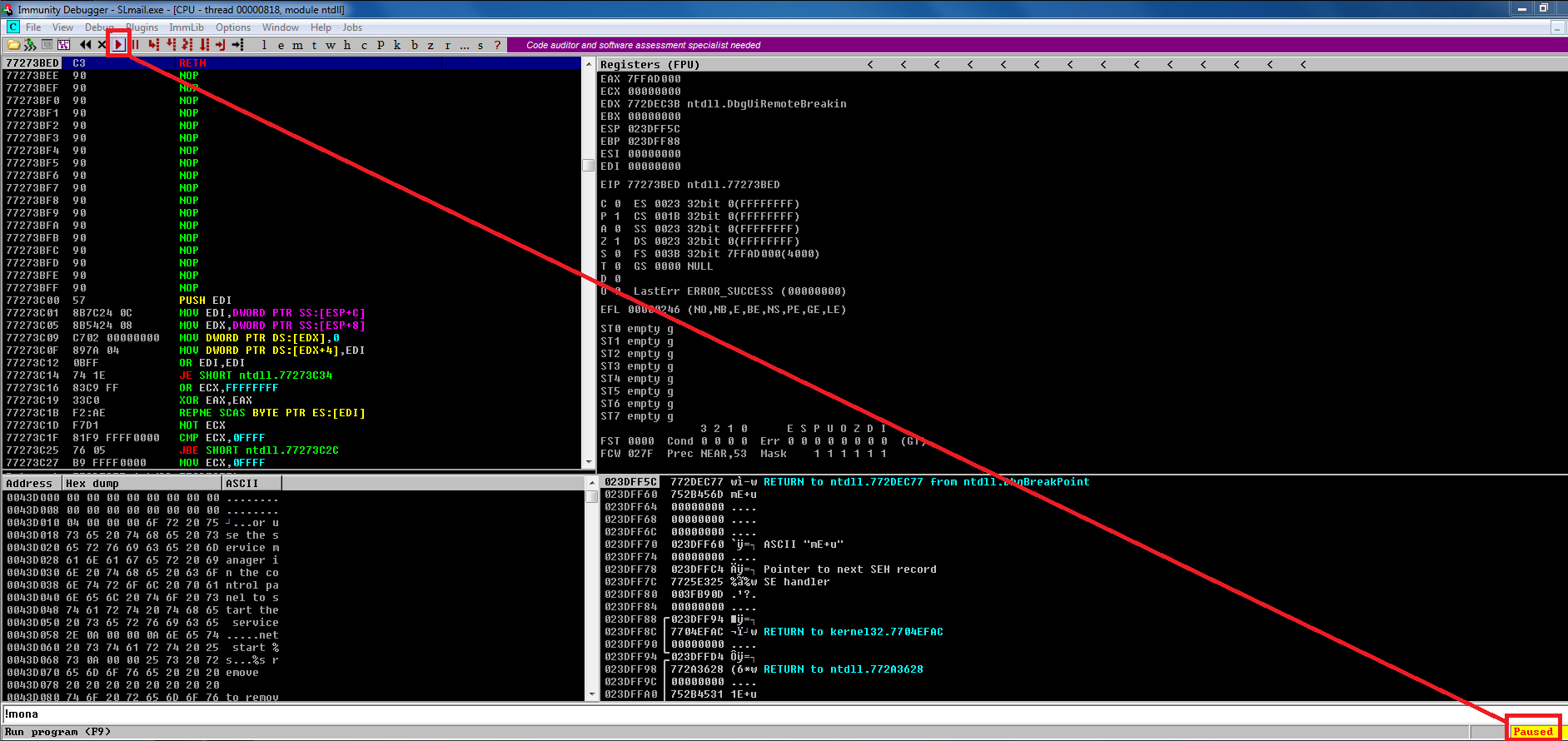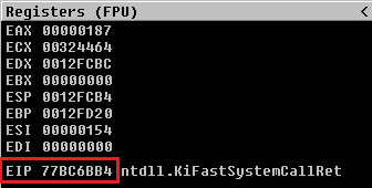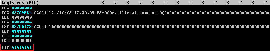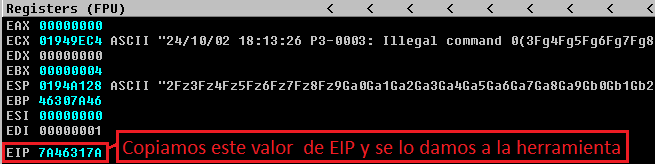 Si prestamos atención en la aplicación de Immunity Debugger veremos que en el panel de arriba a la derecha llamado Registers (FPU) se muestran los registros en tiempo real del proceso de SLmail, vemos valores tales como EAX, ECX, EDX, EBX, ESP (La pila o Stack), EBP, ESI, EDI y por ultimo y el que más nos interesa por ahora EIP, recordemos que este es el Instruction Pointer de la aplicación, es decir, el registro de la CPU que apunta a la dirección de memoria donde se encuentra la siguiente instrucción que se va a ejecutar.