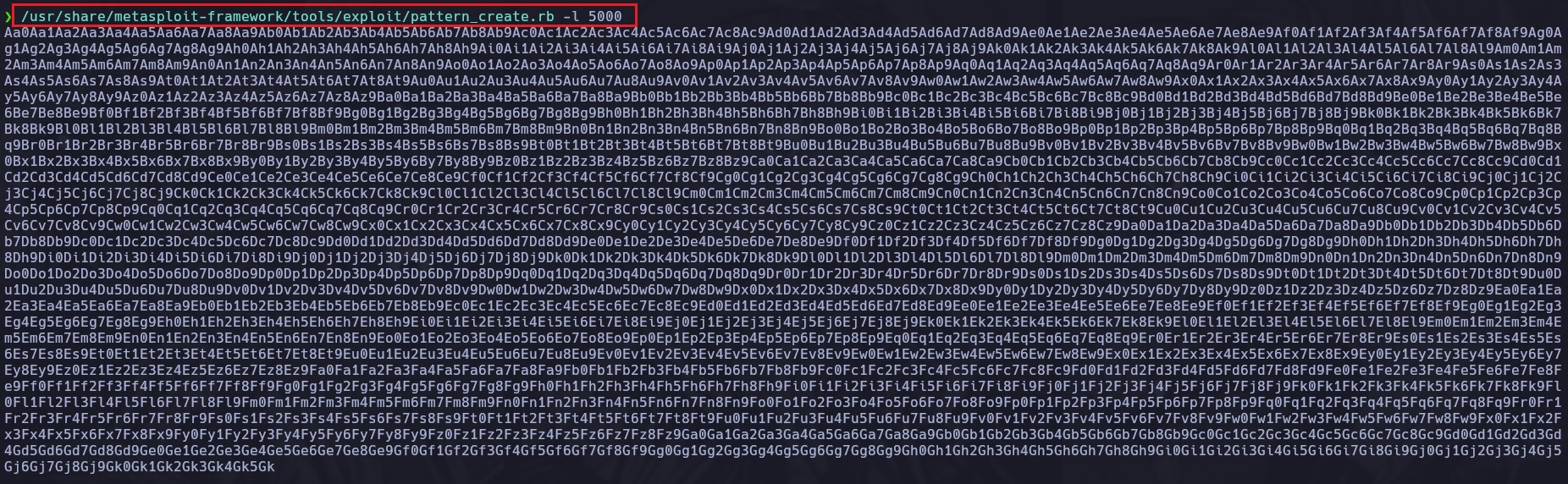 /usr/share/metasploit-framework/tools/exploit/pattern_create.rb -l 5000