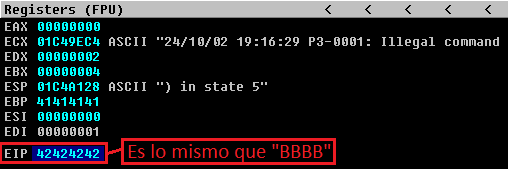 Esto lo que hará será poner 4654 “A” (OFFSET) y después 4 “B”, esas 4 “B” de más son las que aparecerán en el EIP como 42424242.