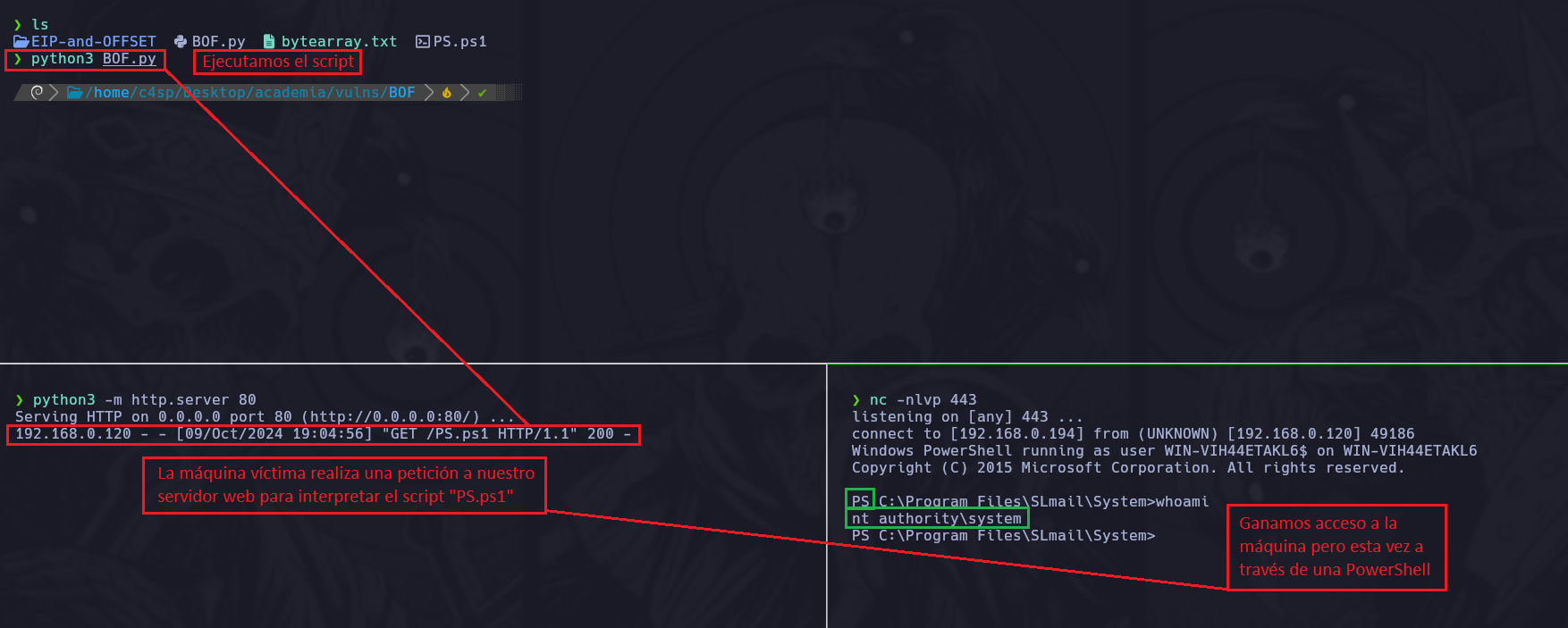 PS.ps1a través del servidor web nuestro, ejecutándolo con la PowerShell de la máquina Windows). - Ejecutamos nuestro script del Buffer Overflow (En mi caso lo renombre de