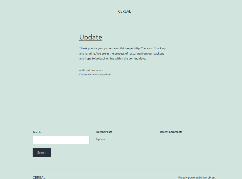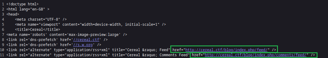 Una vez reconocida la web por nuestra máquina con el ping -c 1 cereal.ctf, ingresaremos a la misma ruta /blog pero con el nuevo dominio obtenido para ver la ruta con todos sus componentes.