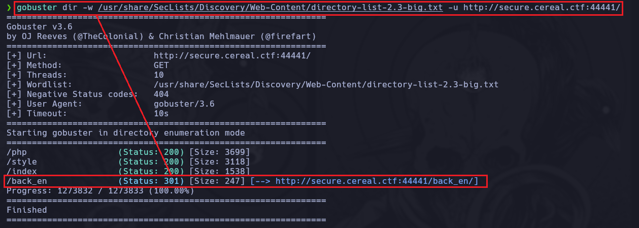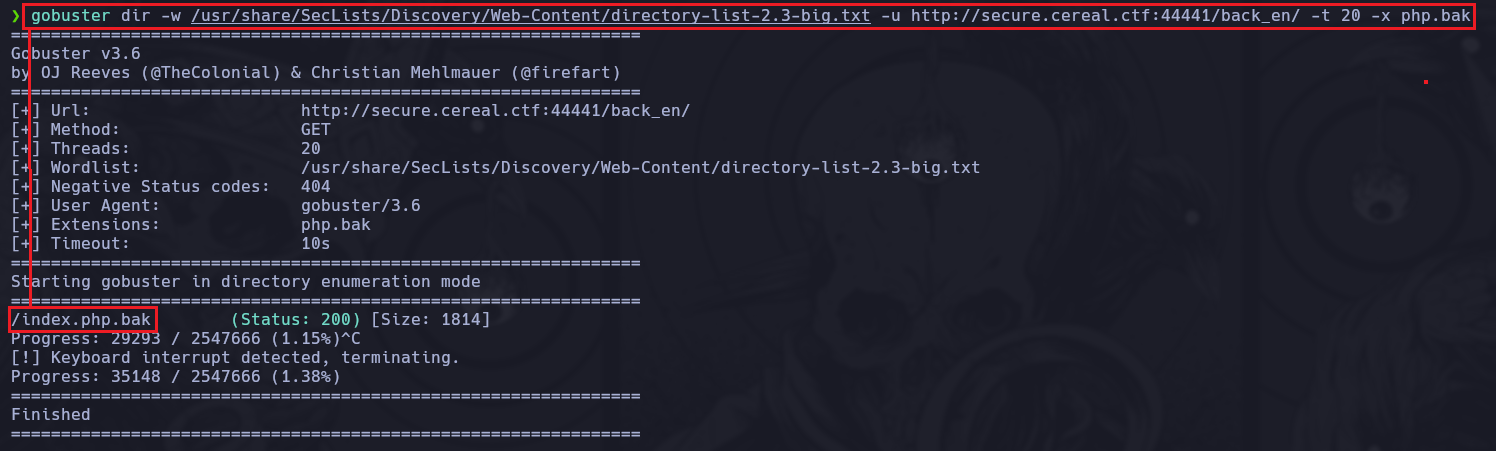• gobuster dir -w /usr/share/SecLists/Discovery/Web-Content/directory-list-2.3-big.txt -u http://secure.cereal.ctf:44441/back_en/ -t 20 -x php.bak