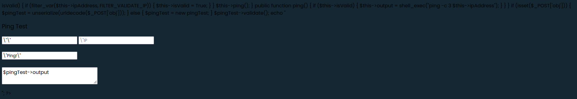 Este código lo que está haciendo es mediante una función validate() validar cuando una IP está siendo colocada, por defecto en la clase pingtest la propiedad $isvalid está en False, pero si la función validate() detecta que hay una IP real en el campo, entonces lo convierte a True y procede a llamar a la función ping(), esta es la manera que tiene la web de sanitizarnos el ; whoami que colocamos antes. Si llegamos a colocar una IP verdadera, el campo $isvalid pasa a ser True y procede a llamar a la función ping() que lo que haces es enviar un Ping a la IP proporcionada, si no colocamos una IP, por defecto le hará un ping a la IP que esté en el campo $ipAddress la cual es 127.0.0.1. Otra cosa que podemos notar es que no hay ningún tipo de sanitización en el campo donde se realiza el "ping -c 3 $this->ipAddress" por lo tanto la petición confía en el objeto que el usuario le envía, recordemos que cuando colocamos una IP esta pasa en formato serializado como un objeto por la red.