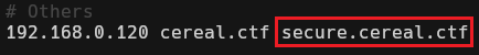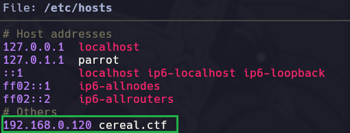 Por lo tanto si hiciéramos un ping -c 1 cereal.ctf no recibiríamos señal de la web, esto se debe a que no tenemos contemplado ese dominio en nuestro /etc/hosts. Lo que debemos hacer en este caso es agregar en nuestro /etc/hosts que la ip 192.168.0.120 corresponde al dominio cereal.ctf.