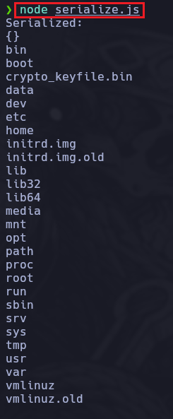 Y luego ejecutamos con node userialize.js nuevamente, nos dará el output del comando ls /