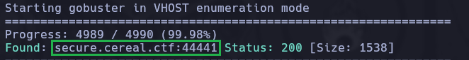 • gobuster vhost -u http://cereal.ctf:44441/ -w /usr/share/SecLists/Discovery/DNS/subdomains-top1million-5000.txt -t 20 --apend-domain