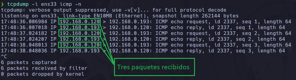 Nos podremos en escucha con la herramienta tcpdump para ver si al enviarnos un ping a nosotros recibimos el paquete o no.