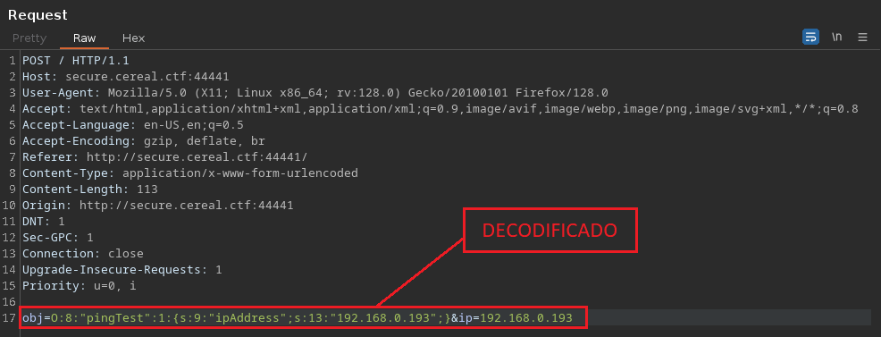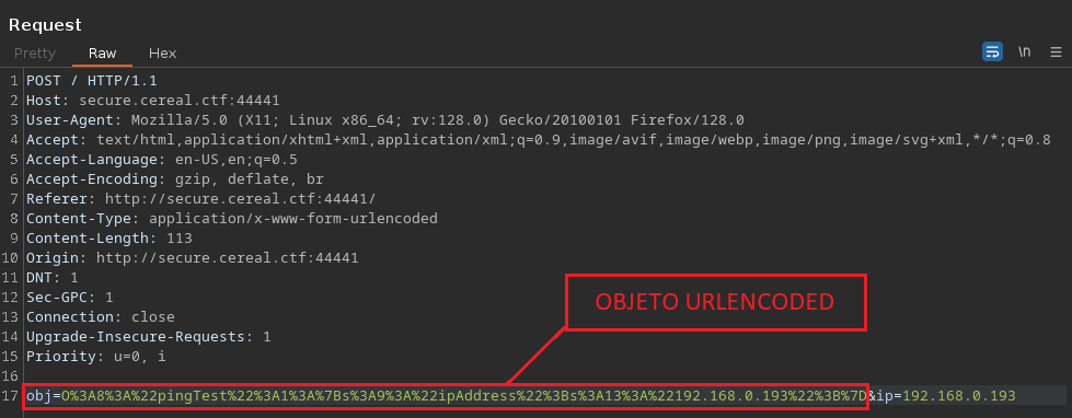 De primeras la información está viajando en formato Serializado, al nosotros darle al botón de Send en Burpsuite lo que sucede es que enviamos el objeto y el servidor procede a Deserializar e Interpretar lo que nosotros le estamos enviando, para luego en base a esto se ejecute una función o un método, es decir una serie de acciones sobre esta entidad/objeto, que en este caso lo que hace es un ping.