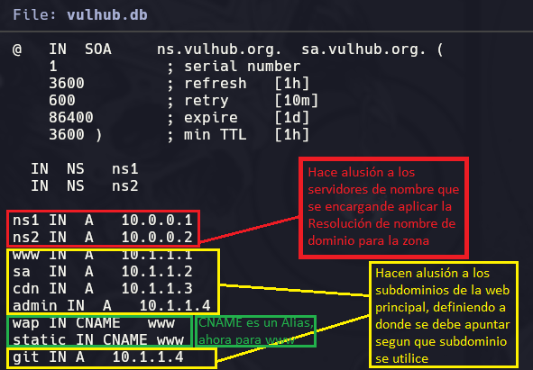 Si miramos el archivo vulhub.db veremos información detallada del servidor web, como sus sub dominios a que IPs resuelven, alias que se conectan a los subdominios y demás.