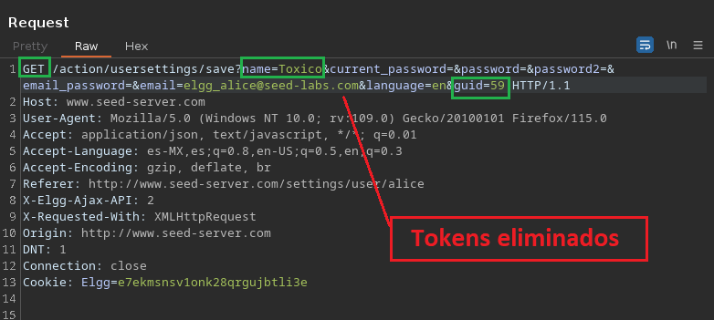 Para comprobar esto borraremos el __elgg_token y el __elgg_ts con sus respectivos valores que marcamos en la foto anterior, luego enviamos la petición para ver cómo se comporta.