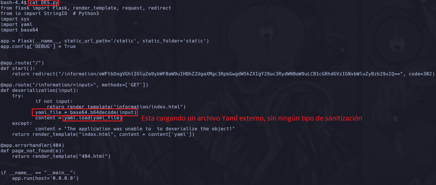 Si nos metemos dentro del contenedor y hacemos un cat del archivo DES.py, veremos una sección particular donde podemos identificar la falta de sanitización.
