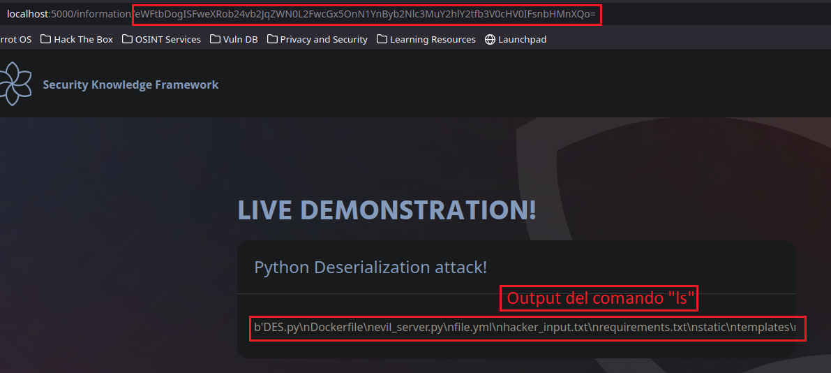 Ahora coloquemos esta cadena en la web para que nos la interprete y tener la respuesta del comando ls
