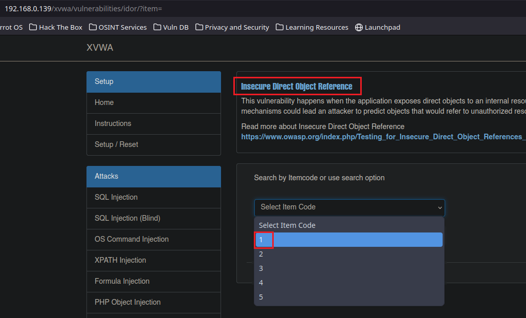 En este caso emplearemos la misma máquina de Vulnhub llamada XTREME que usamos en las Inyecciones XPath y nos vamos a dirigir a la ruta /xvwa, en la pestaña de “Insecure Direct Objeto Reference”.