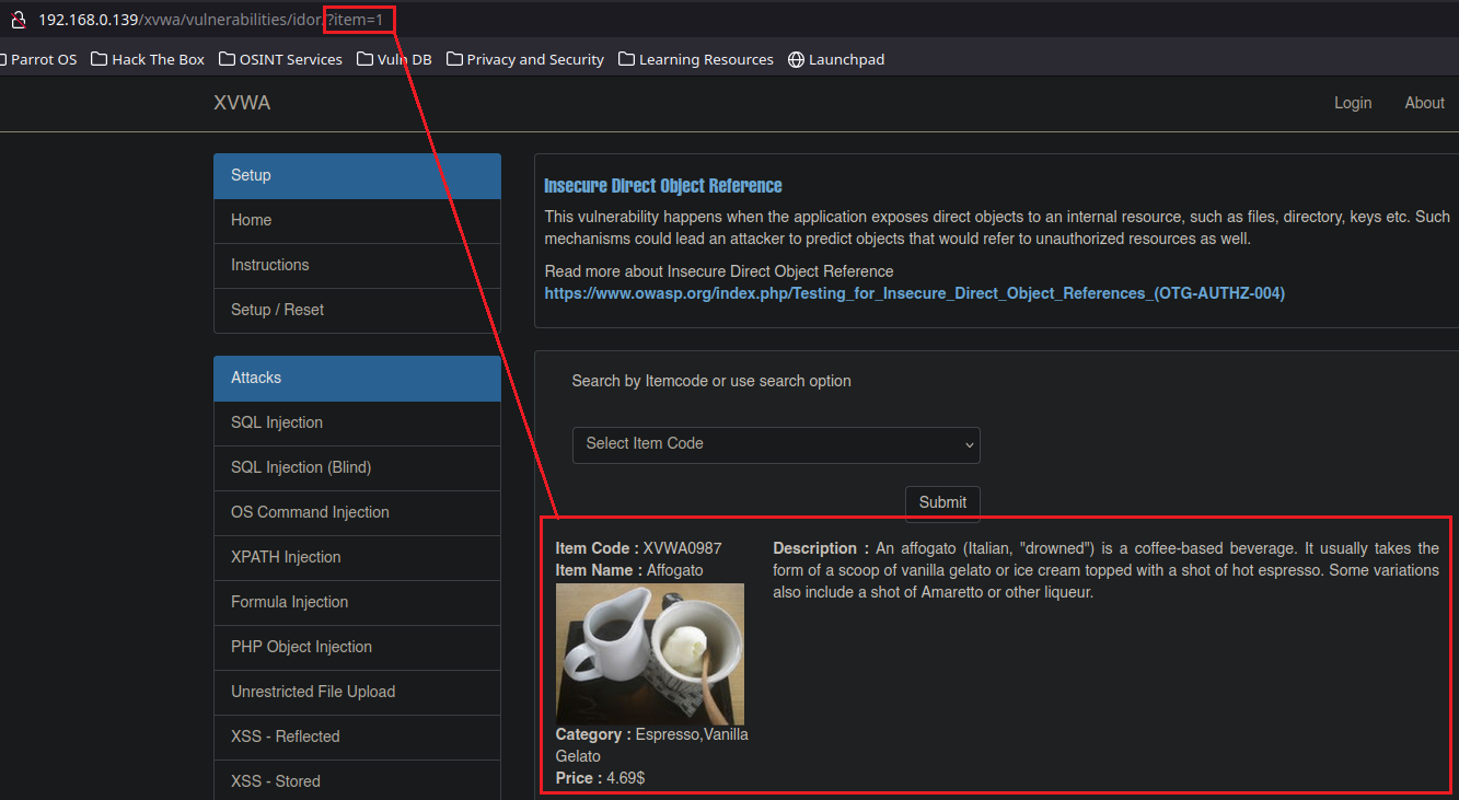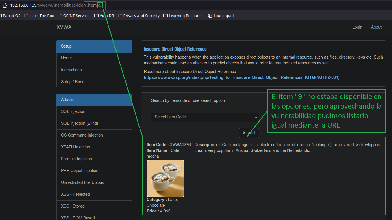 En este sección tendremos la opción de seleccionar el Item code de diferentes tipos de Cafés, al hacerlo en la URL se puede ver a simple vista un parámetro llamado ?item=1 en el caso de seleccionar el Item code1”, si nosotros vamos reemplazando el valor de item, recorriendo por diferentes números que se nos ocurran que no aparezcan en las opciones, podremos llegar a listar contenido que no deberíamos de tener acceso.