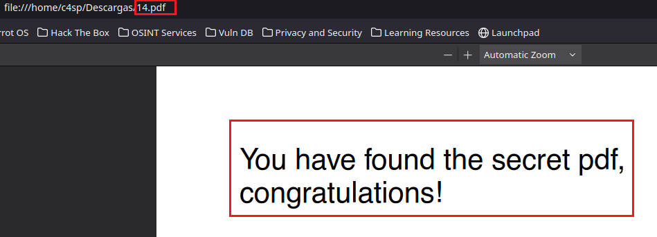 De esta forma conseguiremos acceso a PDFs que no nos corresponden a nosotros como usuarios, en mi caso fue el número 14, que al abrirlo en la web veremos una FLAG.