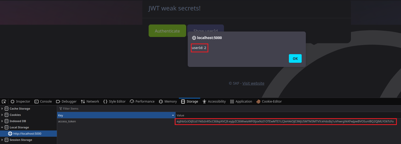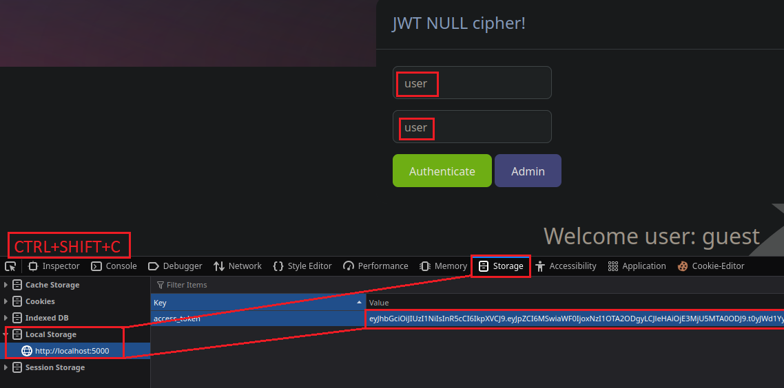 Una vez estando autenticados como user, si presionamos la combinación de teclas CTRL+SHIFT+C, vamos a la pestaña Storage y en la subpestaña Local Storage veremos nuestra Cookie de sesión correspondiente a user.