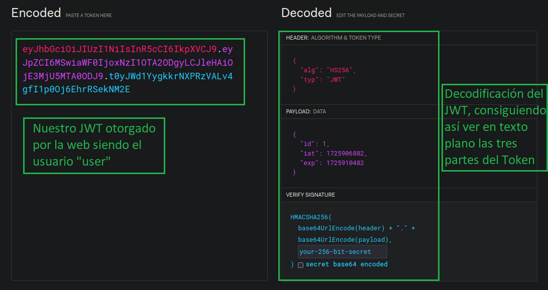 Utilizaremos la web https://jwt.io para poder indagar más en profundidad con este JWT que nos otorgó la web.