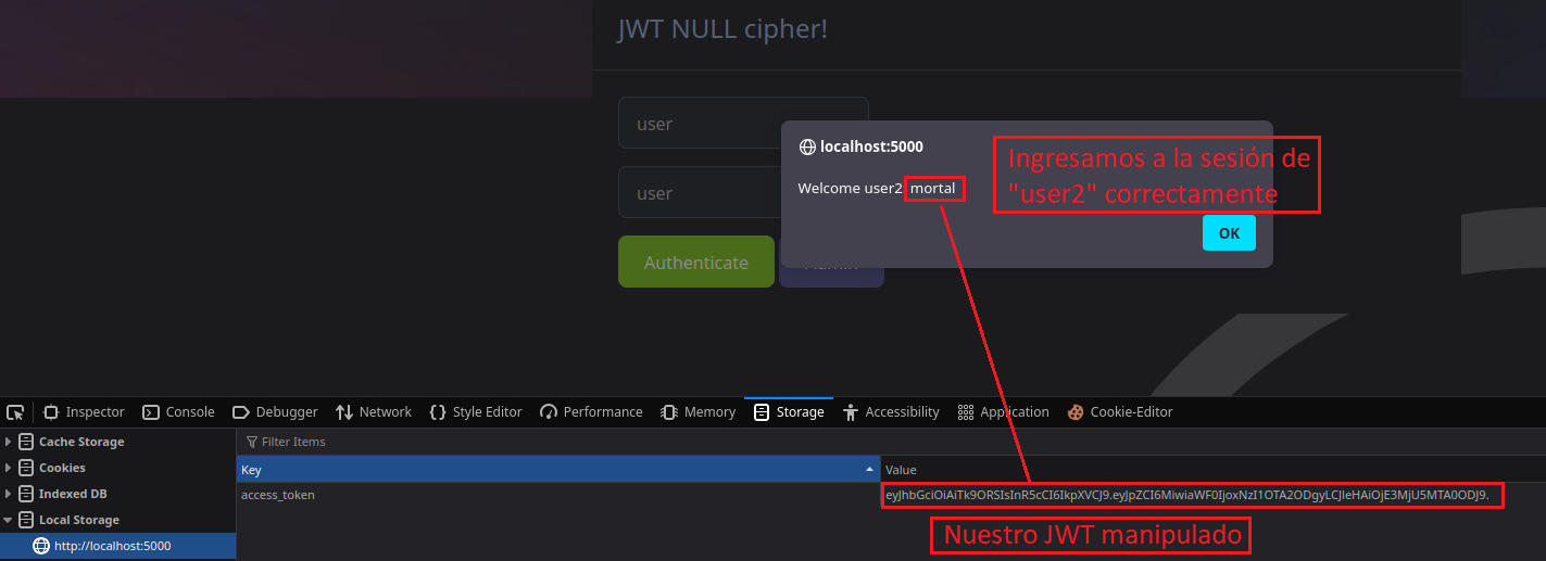 Ahora probemos colocarlo en la web a ver si ingresamos como user2 que recordemos poseía la propiedad “mortal”.