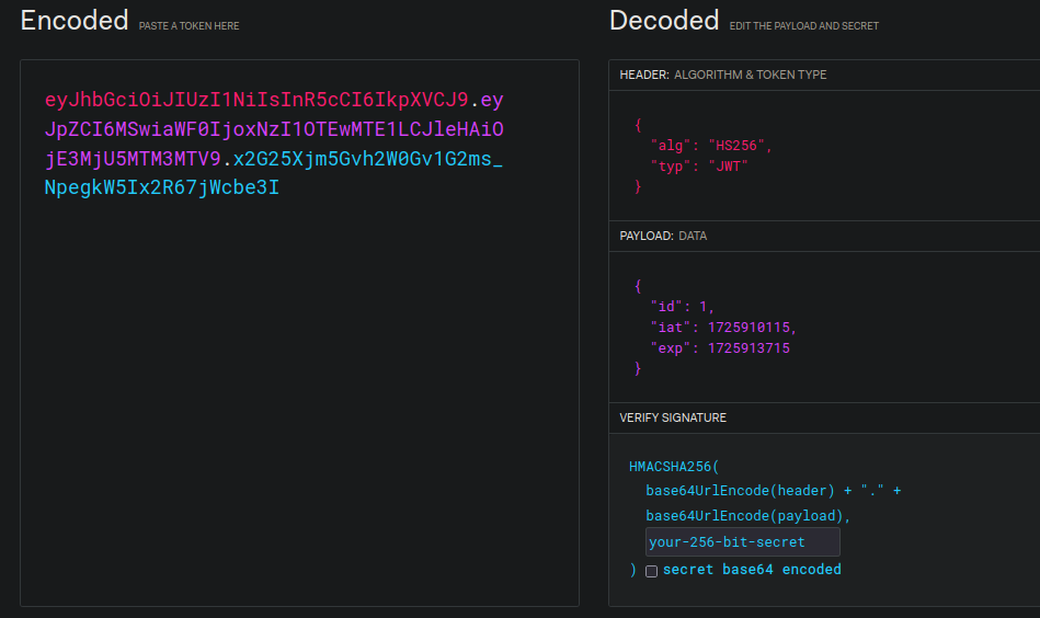 Prestamos atención al apartado de Signature, veremos que dice your-256-bit-secret, este es el secreto del Token que nosotros no lo conocemos. Este secreto suele estár hardcodeado en el aplicativo, específicamente en los archivos de configuración, si tuviéramos un LFI o alguna vulnerabilidad que permita ver los archivos que configuran a la aplicación, podríamos llegar a encontrarlo.