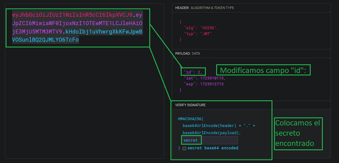 Si nosotros llegaremos descubrir el secreto del Token, ya sea por un LFI o por Fuerza bruta y lo colocamos en esa sección, independientemente de lo que pongamos en el Header o en el Payload, será válido. Con este secreto a nuestro favor podríamos manipular el Header o Payload, para así autenticarnos como otro usuario o modificar el JWT.