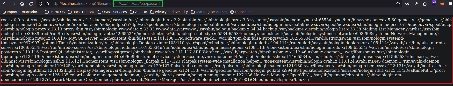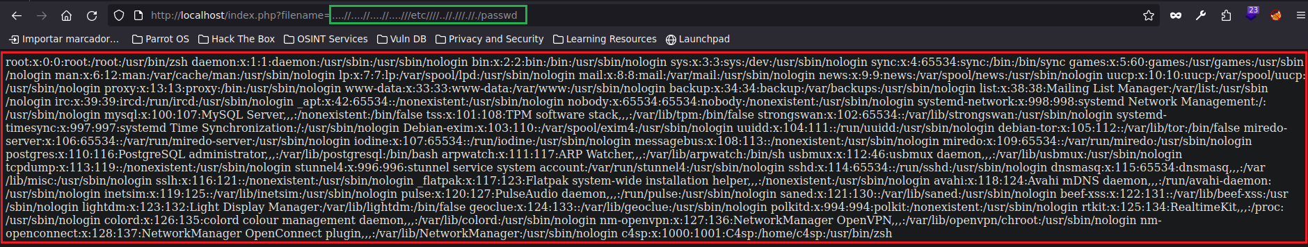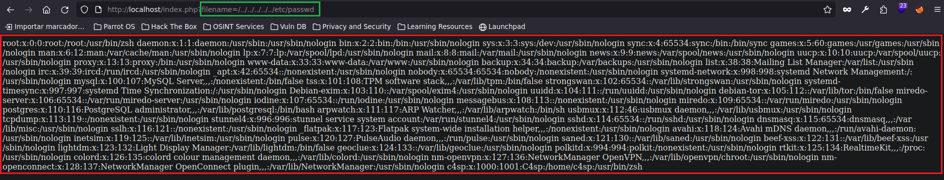 Ahora para vulnerar esta sanitización podríamos hacerlo utilizando en la URL la siguiente cadena de caracteres /../../../../../ quedando tal que así http://localhost/index.php?filename=/../../../../ esto lo que está haciendo por detrás es retroceder de directorios, yendo en dirección a la raíz, por lo tanto luego de esos /../ podríamos listar un archivo especifico de la máquina en una ruta que queramos. Por ejemplo el archivo /etc/passwd