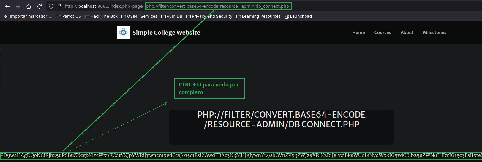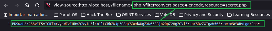 Ahora si hacemos uso del Wrapper php://filter/convert.base64-encode/resource=(archivo.php), podremos ver el contenido en base64, ya que el Wrapper por defecto está habilitado.