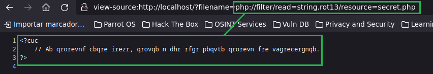 Ahora si hacemos uso del Wrapper php://filter/read=string.rot13/resource=(archivo.php), lo que hará es rotar cada carácter en trece posiciones (CIFRADO CESAR ‘ROT13’) SOLO FUNCIONA CON CTRL+U, SI NO NO SE VERÁ